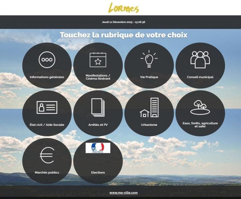 Retrouvez toutes nos informations municipales, nos actualités, nos publications officielles et les événements à venir grâce à la borne interactive de la ville de Lormes. Conçue pour être simple et accessible, elle vous permet d’accéder rapidement à l’ensemble de nos services, documents utiles et annonces importantes, afin de rester informé de tout ce qui concerne la vie locale. Un espace clair, moderne et toujours à jour, pensé pour vous accompagner au quotidien.
